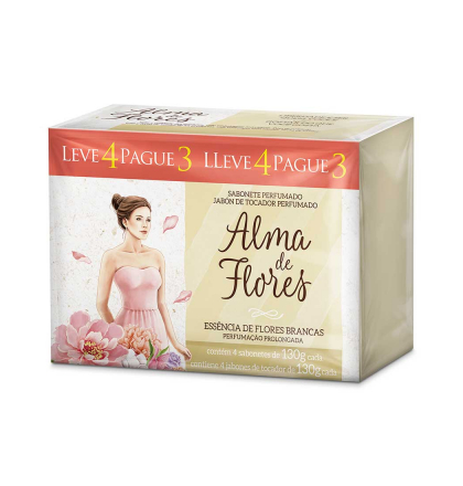 O Sabonete Alma de Flores Flores Brancas Leve 4 Pague 3 contém quatro unidades do Sabonete Alma de Flores Flores Brancas 130g, que apresenta em sua composição o charme e o encantamento das flores. A baunilha faz um acorde perfeito com a flor de íris, confirmando a elegância da fragrância do início ao fim. Conta ainda com perfume intenso, que permanece por mais tempo na pele, proporcionando duradoura e agradável sensação de bem-estar. Tem uma formulação suave e um silicone especial para produtos de banho que, além de criar uma espuma cremosa, forma um filme sobre a pele que a deixa macia e perfumada.
