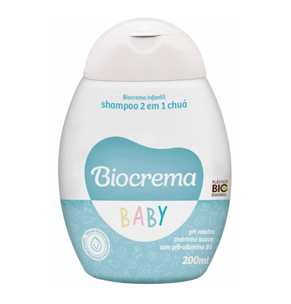 O Shampoo 2 em 1 Biocrema Baby foi desenvolvido especialmente para oferecer cuidado e proteção aos bebês. Ele possui na sua fórmula extrato de camomila e manteiga de karité, rica em vitaminas A, D, E e F. Junto aos outros componentes, ele ajuda a hidratar os frios, além de oferecer brilho e facilitar o pentear e a modelagem.